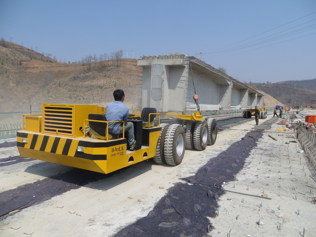 主要適用于預制梁場與架橋工地較遠,不適合鋪軌或鋪軌費用較高的場合。運梁車的剎車系統對縱坡有較大的適應性。輪胎與地面摩擦阻力比軌道式運梁車有顯著的優勢。